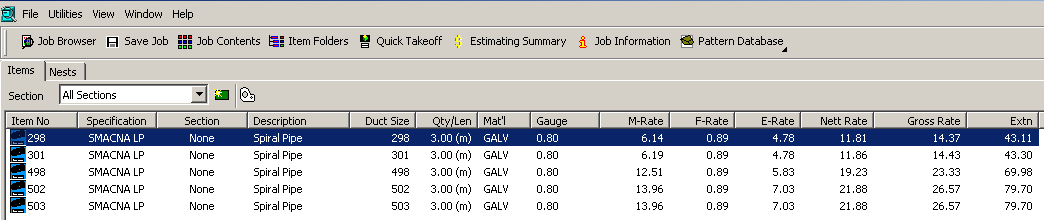 The 298 and 301 entries have been matched and converted to the 300mm item in the base estimate.