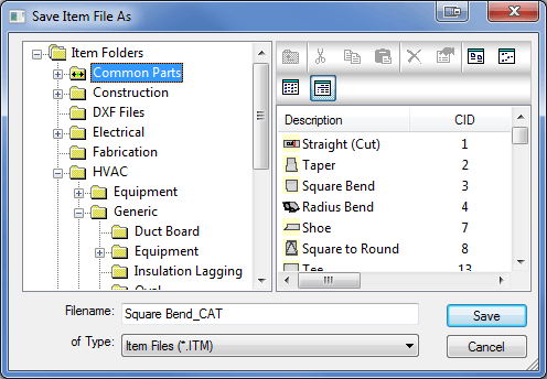 The Save Item File As window is displayed . This gives the user the chance to save the Catalog part to a specific item folder and to give it a specific name.