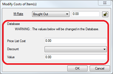 Note: Modifying these cost settings located in the Database section of this dialog modifies the values in the Database.