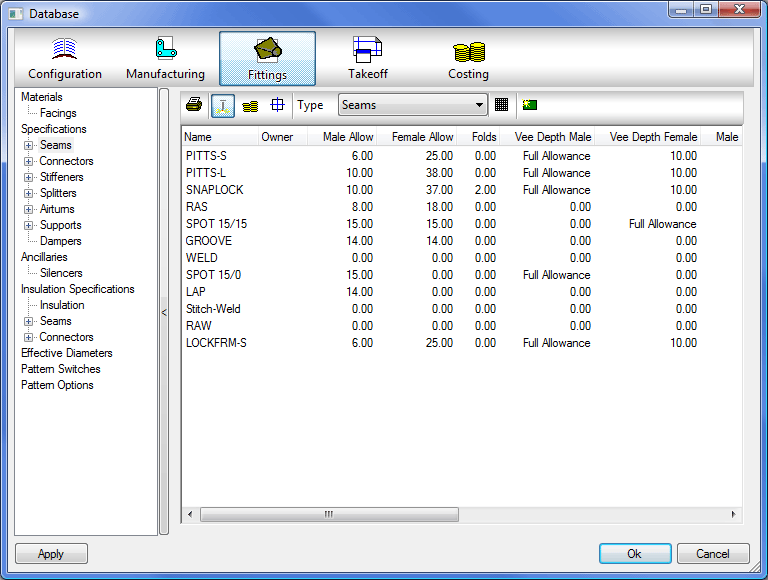 This table defines the various types and allowances associated with the seams used with ductwork. There is no limit to the number of seams that can be defined.
