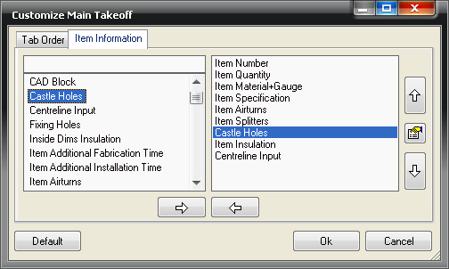 The next stage is to ensure that the Castle Holes option is included on the item list at Takeoff time.