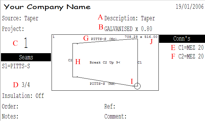 G: This is the Seam information. After the Seam name, the letters in parentheses can be used to assist in the assembly of the duct. On the example above, the 2 seams are marked (Mc) and (Md). The side marked (Mc) will attach to another part with the label marking the seam (Fc).