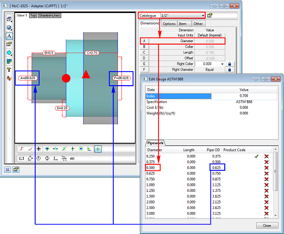 When the nominal diameter is specified as 0.5 inches, as shown in the example below, the outside diameter (Diameter) value is assigned from the material and gauge setting. This is illustrated below, in the Pipework tab at the bottom of the Edit Gauge ASTM 888 dialog.