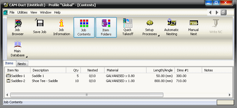 Contents: This window displays the parts that will be cut in the job. Each line displayed shows the individual quantity and the item that will be added to the job. The total number of parts can be calculated by multiplying the individual quantities by the quantity entered in the dialog. The job contents will not show the collection, but will show the individual parts and the item number suffix:
