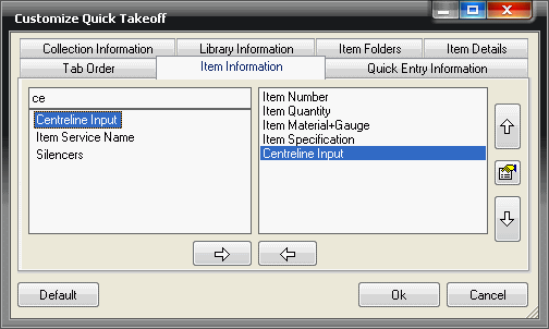 - To add a new item to the displayed information, such as Centerline Input, click once on its name in the left hand pane and click the white right-pointing arrow to add it to the right hand pane. The up and down arrows on the right of the screen can be used to reorder the display of those fields. To remove a field from display, click the left-pointing arrow.
