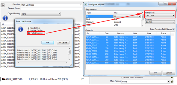 If the Price List Update dialog lists Failed Entries, make sure that on the Configure Import dialog MAP Database Id has been selected for the Id Maps To drop-down list. The Id code in the Price List should be consistent with the item Id in the Product List.