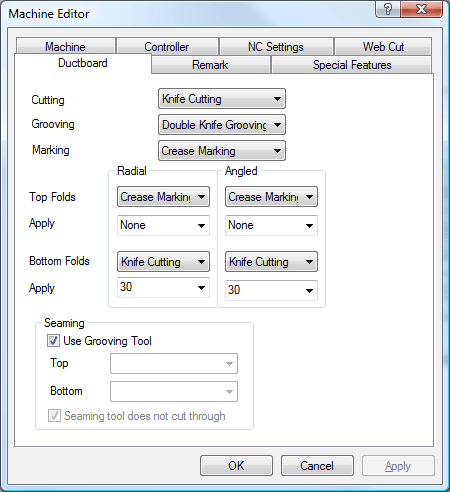 Seaming: This section lets you specify the default grooving tool to apply to the seam chamfers or the user can specify what tool, from the available tools in installed machines, to use when Cutting or Marking Seam Edges.