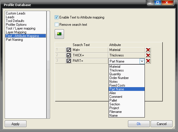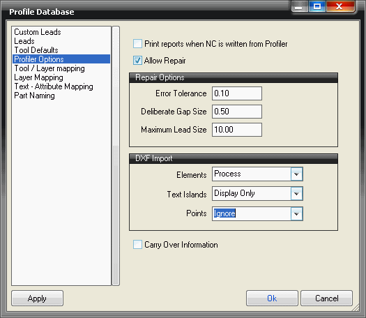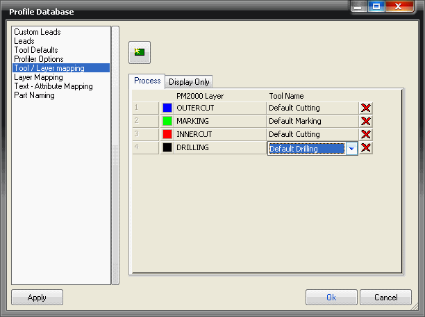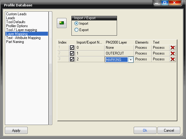 Profiler Database: Profiler is the module responsible for processing imported parts. If the DXF files contains text, tooling or attribute information contained in layers, the layer mapping must be defined in Files