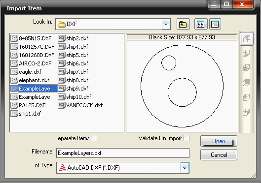 Example DXF Import: Parts can be imported directly into an open job or alternatively they can be imported into item folders for permanent storage and future use.
