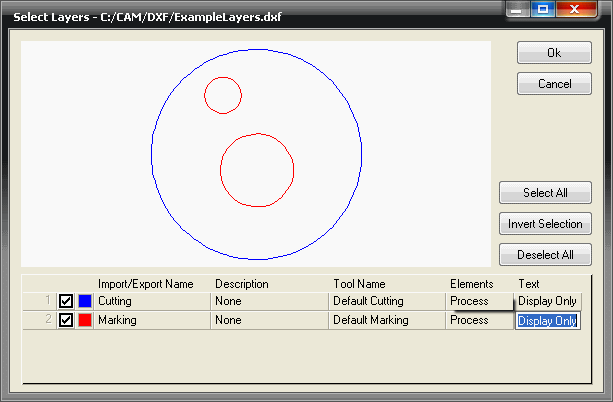 The software layer names are arbitrary, and at this stage, do not imply that the cutting tool or drilling tool will be assigned. Layer mapping must be used in conjunction with Tool / Layer Mapping.