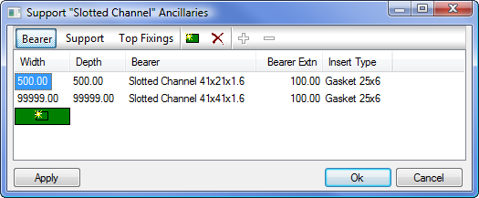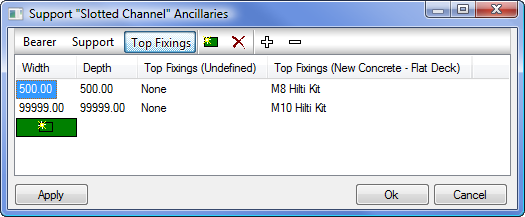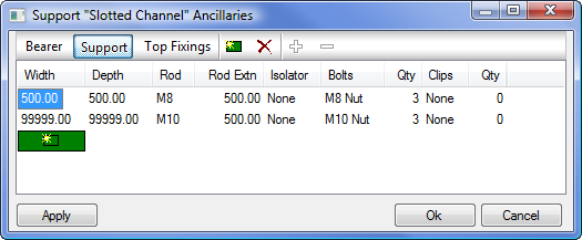 Bolts/Qty: Ancillary Fixings can be assigned and specified a quantity for application onto the Support cost.