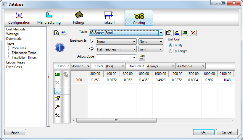 Fabrication tables can be designed to include all ancillaries and have a combined time for fabrication, or can be used to solely insert the carcass assembly time and have flanges separately using connector fabrication time.
