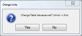 Clicking Yes at this prompt immediately updates the numeric values in the table according to the new Units type selected. Clicking No at this prompt leaves the numeric values in the table set as they are currently set (does not update the numeric values in the table); however the Units type is updated.