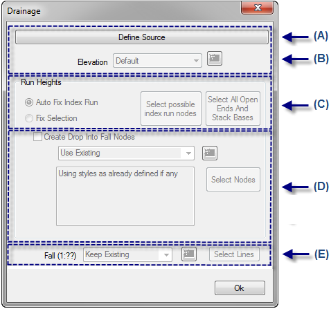 Run Heights: Within a drainage system, fixed items / nodes need to be set to maintain specific run height with a system. Various selection options are available. You can automatically or manually fix for coordination purposes. Within the logic of the tool, various design selections can be executed. For more information, see Drainage Tool - Run Heights.