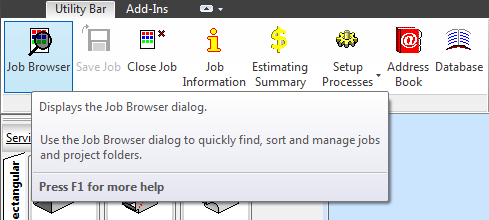 Tooltips: Hovering the mouse cursor over a command on the ribbon displays a tooltip with information about the command. Pressing the F1 key on the keyboard while hovering over a tooltip on the ribbon automatically displays a context-sensitive Help topic associated with the command. The example below shows the tooltip that displays when mouse-hovering over the Job Browser command.