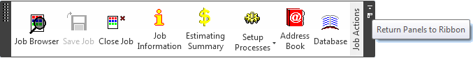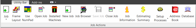 The commands (or buttons) included on the ribbon are organized into tabs and panels. The example below shows two tabs (Utility Bar and Add-Ins) and one panel (Job Actions).