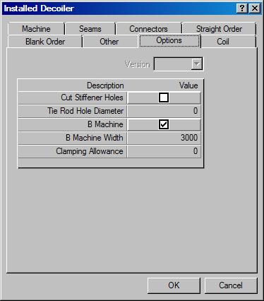 This tab is used to control machine specific options. For the Forstner decoiler, the two most import options are the B Machine option, which enables the use of the second line, and the B Machine Width option, which should be set to the width of the 2 second line. The second line is normally used for making standard length straights.
