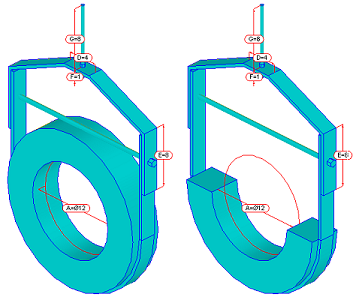Insulation Shield: Specifies whether or not the Insulation Block is drawn (placed) fully wrapped-around the hanger, which would encompass the entire pipe or duct part, as shown on the left below, or when No is selected, the Insulation Shield is placed on, and only wraps around a portion (half) of the hanger, as shown below on the right.