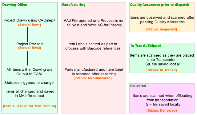 The example below illustrates a typical scenario for tracking the items from a drawing stage through to delivery to site.