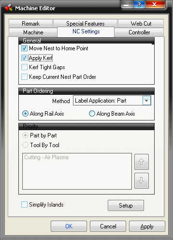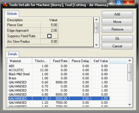 You now need to enter some figures to define Kerf, for example if the tool width, or kerf value for a given material/gauge = 2mm, enter 2mm in the material database.