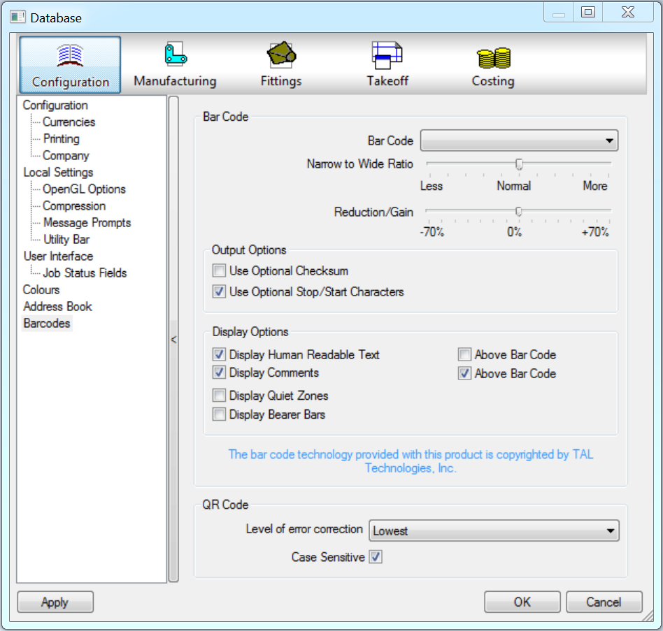 To configure a Fabrication product for use with Tracker and bar codes or QR codes, configure the Database Barcode options as described below.