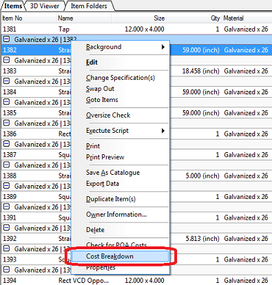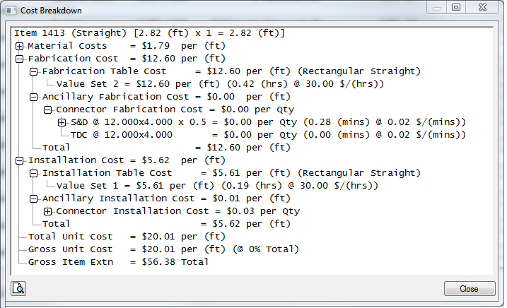 The Cost Breakdown dialog displays all of the cost information assigned to an item, including material costs, fabrication cost, installation cost, total unit cost, gross unit cost, and gross item extension cost. A sample Cost Breakdown dialog for a rectangular straight is shown below.