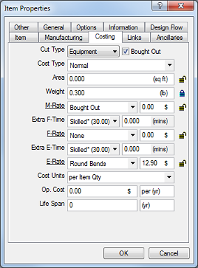 The Item Properties dialog shown below is for a bought out piece of equipment (round bend).
