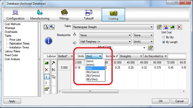 Fabrication (or Installation) Times. On the Database dialog, use the Units drop-down list to select a new time unit, as shown below.