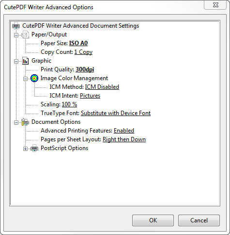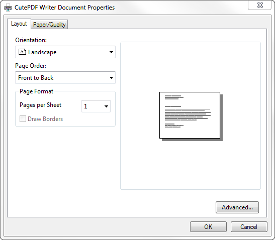 - Click the Advanced tab. The PDF Printer dialog displays: