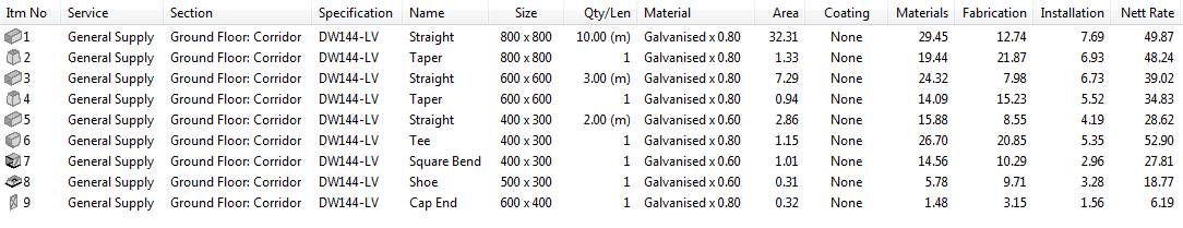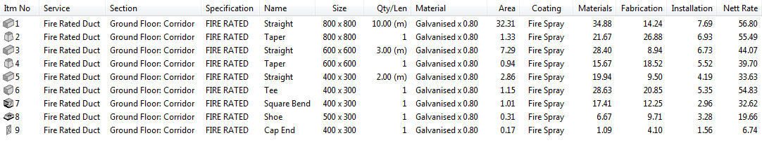 In this example, the Fire Rated Duct service is selected. This service has additional duct facing for fire spray and some additional time allocation for fabrication.