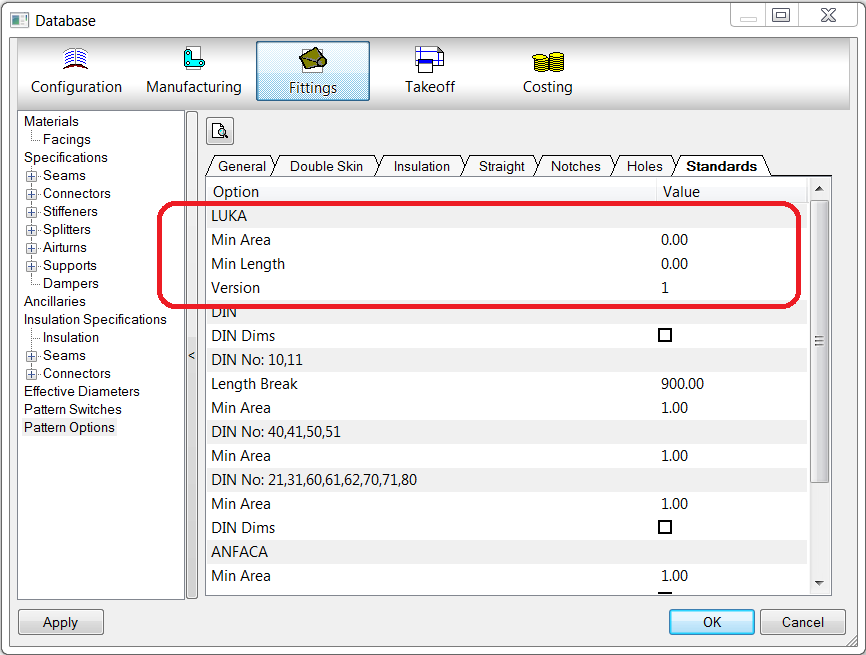 LUKA is an HVAC design convention or standard used primarily in the Benelux countries. LUKA area calculations are supported by some rectangular patterns, such as bends, branches, drop cheek bends, cap ends, grills, radius offsets, reducing radius offsets, roof kerbs, square to rounds, straights, straights with branches, tapers and tees. There are two versions of LUKA area calculations supported: version 1 and version 2. Version 1 follows the original LUKA handbook calculation method. Version 2 only applies to bends, drop cheek beds, and reducing radius offsets. In the Fabrication products, for the patterns that are equipped with LUKA area calculations, you can select which version of the LUKA area calculation method is used; 1 or 2.