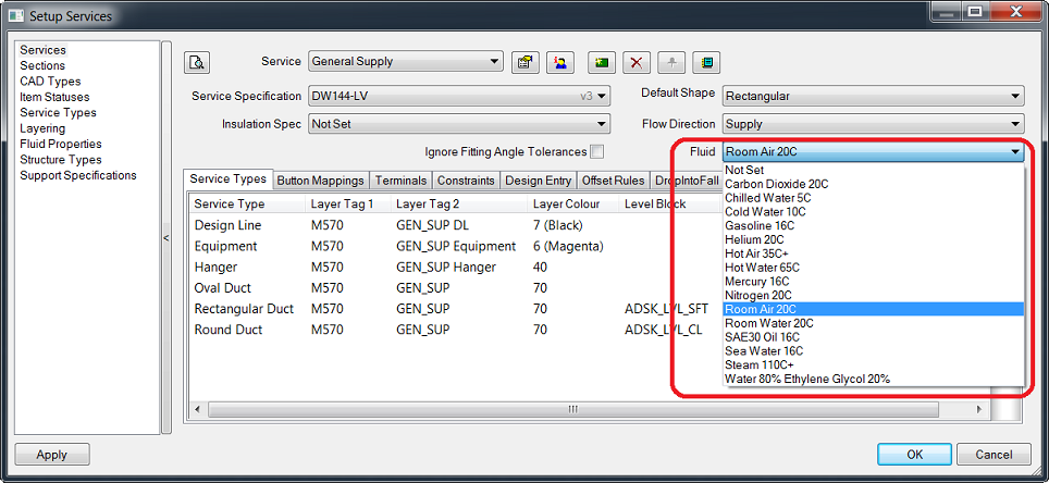 Design Line functionality uses fluid property definitions during flow calculations. For example, in the Service Database, fluid properties such as description, density, and viscosity are defined. Each Service may reference one fluid type.