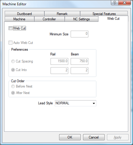 On the Machine Editor dialog, the Web Cut tab defines the criteria for web cutting the material that remains on the sheet after the profiled parts have been cut out, in order to make the scrap more manageable. It is usually used with oxyfuel machines, cutting thick materials, or laser machines cutting with very small kerf, to facilitate the removal of the profiled parts from the surrounding material.