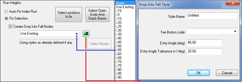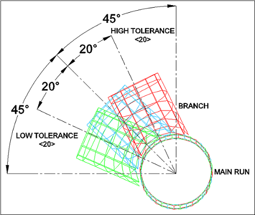 The Preferred Branch Entry Angle currently selected is stated in brackets, in this case <45> (45 Degrees). The Low tolerance & High Tolerance options may be selected and adjusted as necessary by typing LT or HT at the command line when prompted. In the example illustrated below the Low & high Tolerance values are set at <20> (20 degrees), MAP Software will try to provide a solution for the entered angle and will also try angles between entered angle-LT and entered Angle +HT.