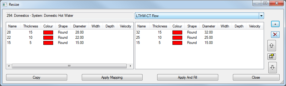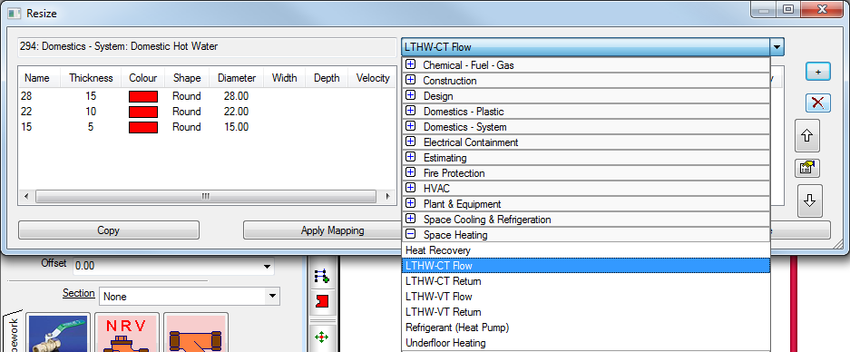 The Resize dialog allows users to switch the material and sizes of previously drawn Design Lines. A common example of this is for switching Copper to Steel. This can be utilised for reviewing cost differences between installation times or supplier prices.