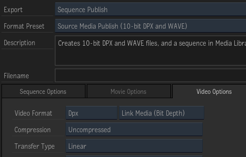 Source Media Publish (10-bit DPX and WAVE). Notice under Video Options the Link Original Media option set to Link Media (Bit Depth)