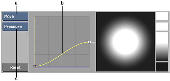 Adjust the pressure profile to change the amount of pressure needed to paint with a given brush. The slope of the curve indicates how quickly paint is applied as you press on the tablet. If the curve is steep, a small amount of pressure applies full paint to the canvas. If the curve is soft and rounded, you must press harder and longer to apply full paint.