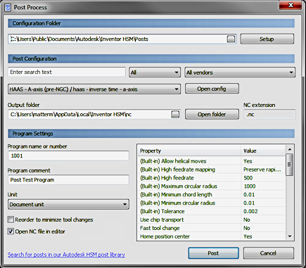 After selecting the Post Processor, press the Post button at the bottom of the page. If the "Open NC file in Editor" is checked, the default Editor will open and display the NC output.