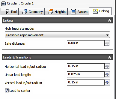When enabled the lead in/out movement will start from the center of the hole or pocket.