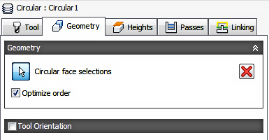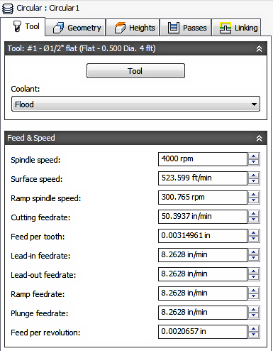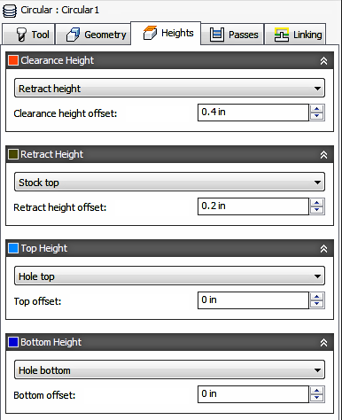 Circular is used for milling cylindrical holes and bosses. You can only select Circular Faces for this toolpath. Heights and depths are determined from the selected Face. Circular will ramp on and ramp off for each pass around the profile. It does not stay in contact like the Bore Toolpath.