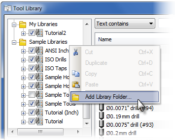 If you wish to keep your tool libraries in a different folder on your PC, or on a network share, you can add additional library folders by right-clicking in the library tree and selecting Add Library Folder from the pop-up context menu.