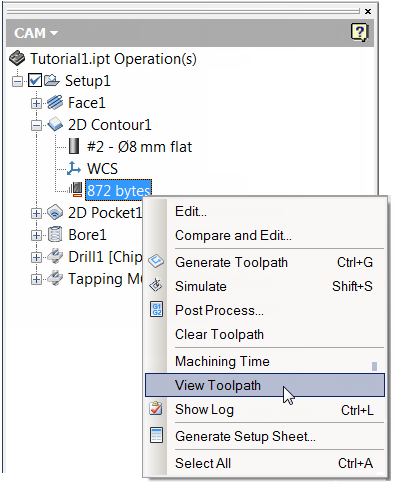 View Toolpath provides low-level information about the toolpath in a list format that, in some cases, can be more convenient than actually simulating the toolpath. It is available from the CAM Browser by right-clicking the toolpath component of an operation and selecting View Toolpath from the pop-up context menu.