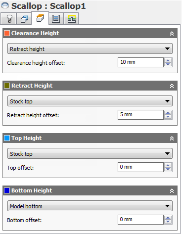 Bottom height determines the final machining height/depth and the lowest depth that the tool descends into the stock. Bottom height needs to be set below the Top. Bottom height is used together with the subsequent offset to establish the height.