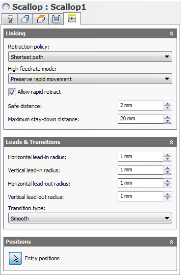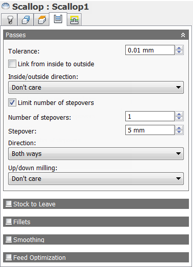 The Scallop Finishing strategy, sometimes also called Constant Stepover Finishing, creates passes that are at a constant distance from one another by offsetting them inwards along the surface. The passes follow sloping and vertical walls to maintain the stepover.