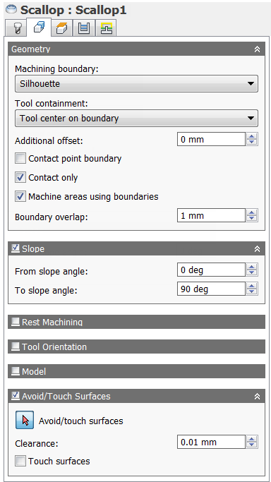 When using slope confinement and/or rest machining for a Scallop operation, you can enable the Machine areas using boundaries check box on the Geometry tab to start offsetting the toolpath from the boundaries created by the slope and/or rest material detection.