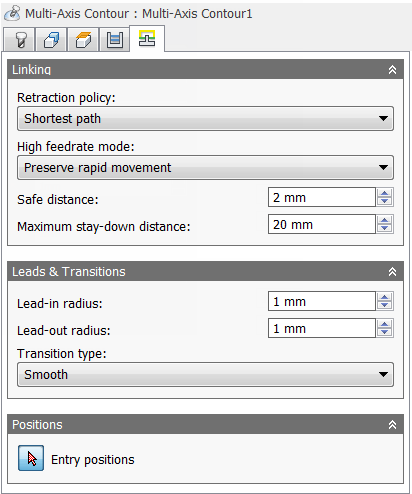 The Multi-Axis Contour strategy for machining is done with the tip of the tool along a given contact curve. By default, the tool is normal to the surface but lead/lag and sideways tilt can be applied, when desired, to control the contact point on the tool. The strategy allows center, left, and right compensation.