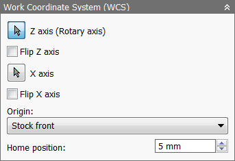 The Work Coordinate System (WCS) specifies the global coordinate system in which the post processed toolpath is output. The WCS defaults to the model orientation.