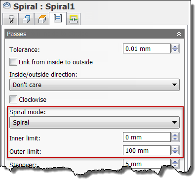 The Spiral Finishing strategy offers several different modes of operation. The mode is selected from the Spiral mode drop-down list located on the Passes tab.