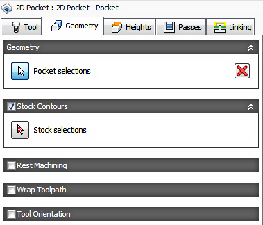Select Faces, Edges or Sketches. You can remove stock from the inside of a pocket or the outside of a standing boss.