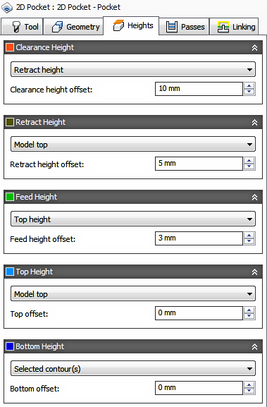 Retract height sets the height that the tool moves up to before the next cutting pass. Retract height should be set above the Feed height and Top. Retract height is used together with the subsequent offset to establish the height.